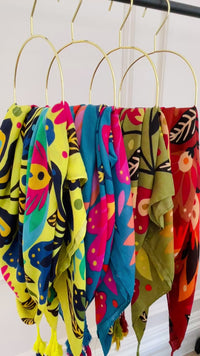 - Cotton mix Lotus print scarf with hanging tassel ends.