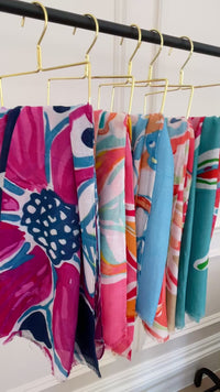 This large floral scarf adds a pop of bright summer colors to any outfit. Made with a soft cotton blend, it can be worn as a neck scarf, shawl wrap, or sarong. The lightweight, easy to wear design makes it a versatile and stylish accessory. Perfect for any occasion.