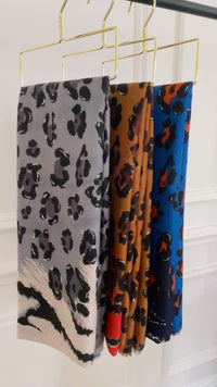 - Large pale pink and grey two tone shawl scarf with zebra and leopard animal prints.