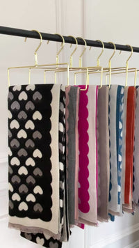 This large rust orange heart print scarf blends cashmere and viscose for a sumptuous plush texture. Featuring a reversible two-tone design in warm, earthy hues, its oversized shape and fringed edges offer versatile styling as a neck scarf, shawl, wrap, or wearable blanket. Crafted for effortless elegance and comfort, this luxurious winter accessory enhances any outfit with its rich colour palette and sophisticated appeal.