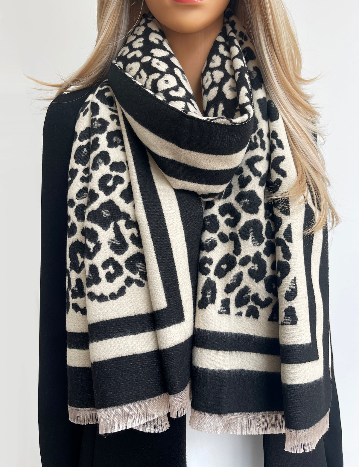 LARGE BLACK CREAM LEOPARD PRINT REVERSIBLE WINTER SHAWL BLANKET SCARF